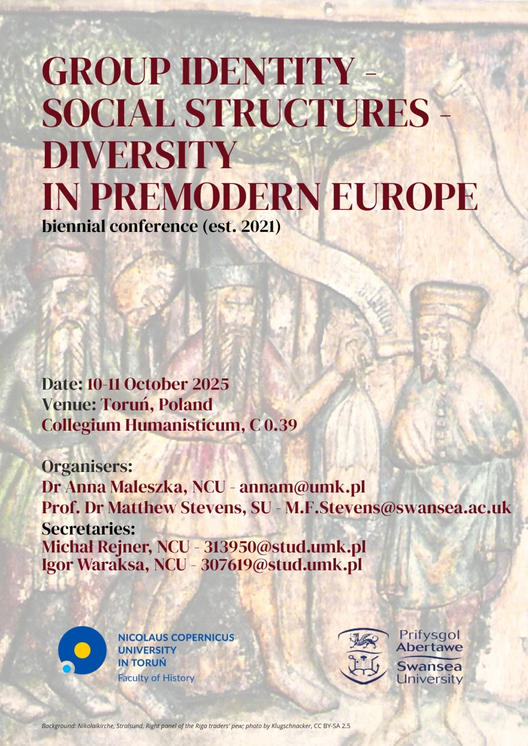 W dniach 10-11 października 2025 roku na Wydziale Nauk Historycznych UMK odbędzie się międzynarodowa konferencja Group Identity - Social Structures - Diversity in Premodern Europe, organizowana wspólnie przez nasz Wydział i Uniwersytet w Swansea (Prifysgol Abertawe).